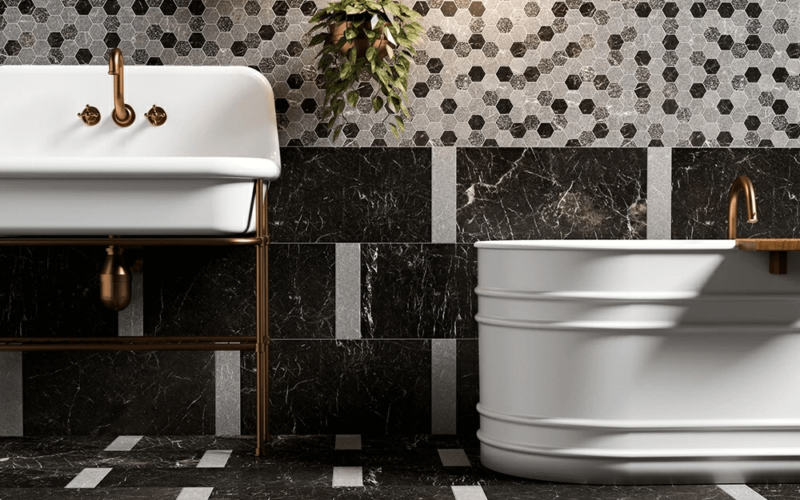 Black zellige tiles are one of the most popular design choices of this year. Pair them with white zellige tiles for a black and white bathroom tile look.