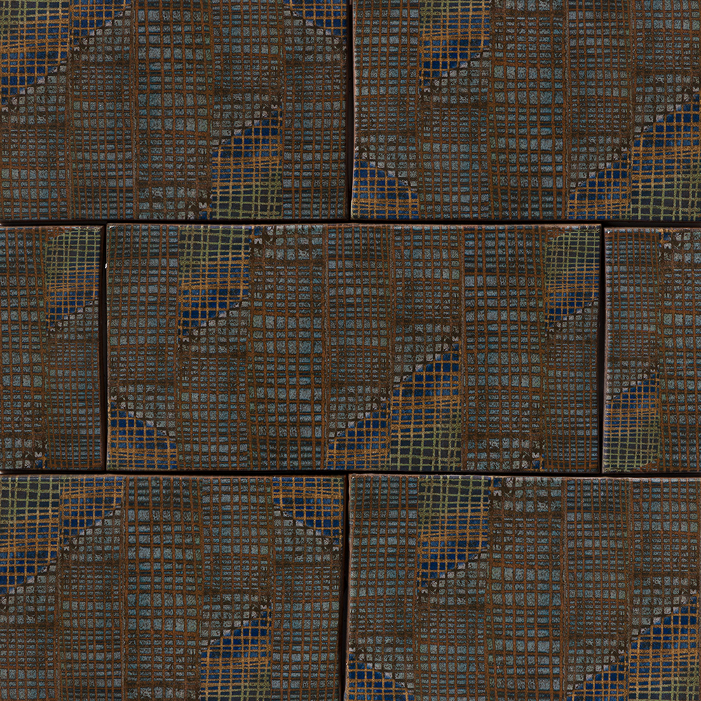 Look: A rich blend of grid-like texture, overlapping colors, and earthy terracotta warmth. The subtle sheen of the semi-matte finish enhances the layered design while maintaining a grounded, handcrafted appeal.