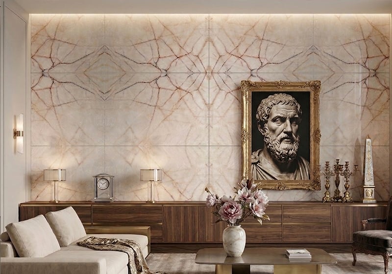 Variation of shades is an inherent characteristic of marble, stone and ceramic tile – mix tiles from several cartons as you set, for a blended effect. Begin installing tiles in the center of the room, one grid at a time. Finish each grid before moving to the next. Start with the first tile in the corner of the grid and work outward. Set tiles one at a time using a slight twisting motion. Don't slide tiles into place. Insert tile spacers as each tile is set, or leave equal joints between tiles. Fit perimeter tiles in each grid last, leaving 1/4" gap between tile and wall. Any rectangle porcelain should never be set in a running bond pattern, rather no more than a 1/3 overlap; the joint should be widened to 3/16" and use of a large unit porcelain mortar should be employed. When grid is completely installed, tap in all tiles with a rubber mallet or hammer and wood block to ensure a good bond and level plane. Remove excess adhesive from joints with a putty knife and from tile with a damp sponge. Do not walk on tiles until they are set (usually in 24 hours).