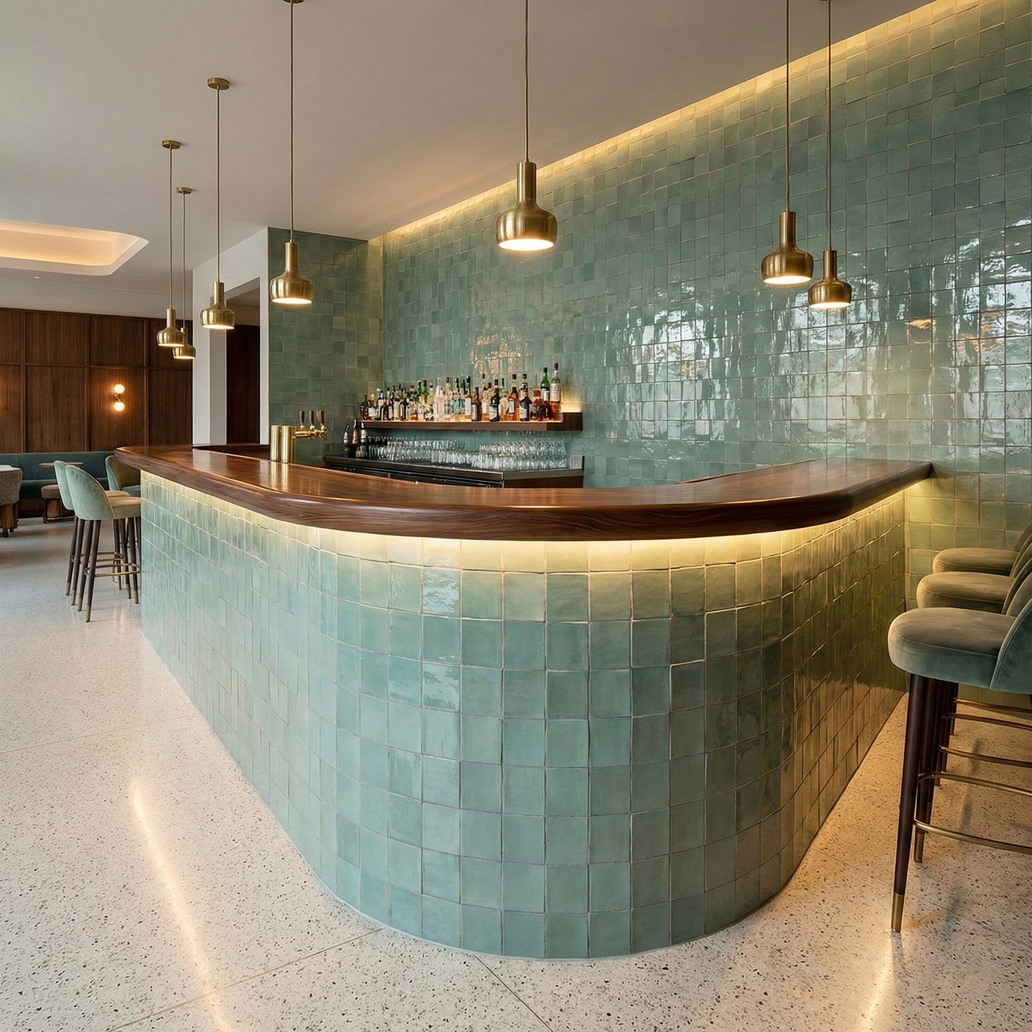 The Dayat shade features a soothing blend of pale aqua, muted turquoise, and fresh mint greens. When installed, these tonal variations create a calm, organic wall surface with a luminous sheen. Its glossy handmade finish gives any space a refined yet relaxed elegance the perfect balance designers look for when they want a touch of authenticity with modern style.