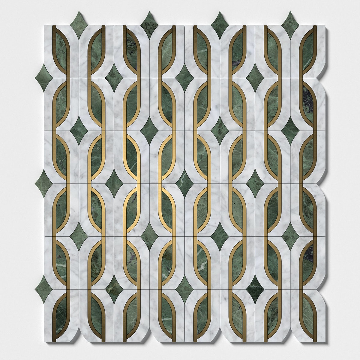 White Carrara, Brass, Verde Tia Honed Butterfly Marble Mosaic